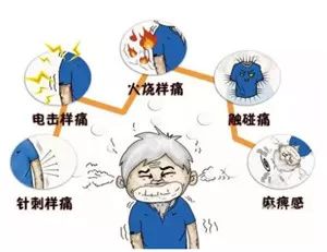 表現(xiàn)為:身體某部位(神經(jīng)支配區(qū))陣發(fā)痛、閃電痛、燒灼痛、針刺痛、觸摸痛、麻木痛。