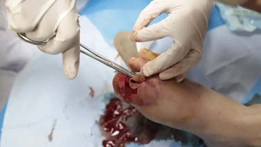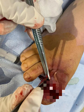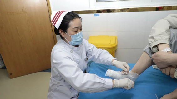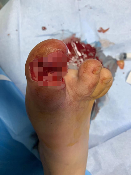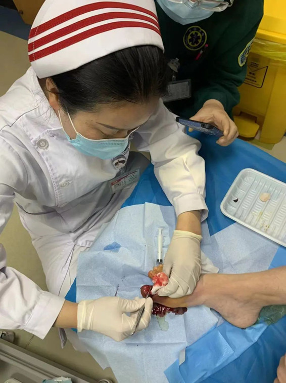 傷口門診負(fù)責(zé)人護(hù)理部主任趙靜詳細(xì)為患者進(jìn)行了檢查,發(fā)現(xiàn)其趾甲部分?jǐn)嗔眩诇霞t腫、破潰,無(wú)活動(dòng)性出血,腳面腫脹明顯,疼痛不能耐受,既往傷口處曾自涂云南白藥3天。趙靜主任發(fā)現(xiàn)患者情況不能再拖延,當(dāng)即在局麻下為患者進(jìn)行右足感染傷口切開引流術(shù),引流出大量膿液,因感染嚴(yán)重,指甲拔除,傷口處給予“插花”引流。目前患者正在恢復(fù)當(dāng)中。