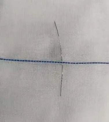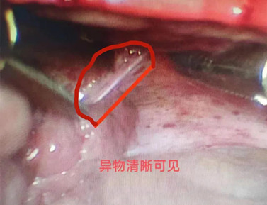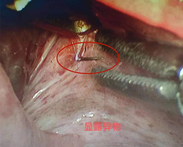 完善術(shù)前相關(guān)檢查,于源副主任醫(yī)師在王碩醫(yī)生的配合下為患者行腹腔鏡探查,術(shù)中在左附件區(qū)腹膜后方探及細針樣條索影,仔細辨別,可見針尖樣金屬物,順細針走形方向,抽絲剝繭般完整取出異物,長約6CM,直徑約0.5mm。
