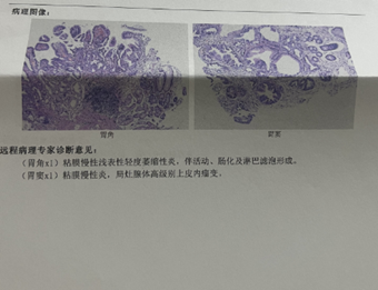 消化內(nèi)科楊國(guó)帥醫(yī)生為鄭先生做胃鏡檢查時(shí)在胃竇部發(fā)現(xiàn)一處病變,楊國(guó)帥醫(yī)生高度懷疑早期胃癌病變(高分化型)。與患者及家屬溝通該病變的具體情況后隨即在此處做了粘膜組織活檢,3天后的病理結(jié)果提示為局灶高級(jí)別上皮內(nèi)瘤變(早期惡性腫瘤),與內(nèi)鏡下肉眼判斷一致。