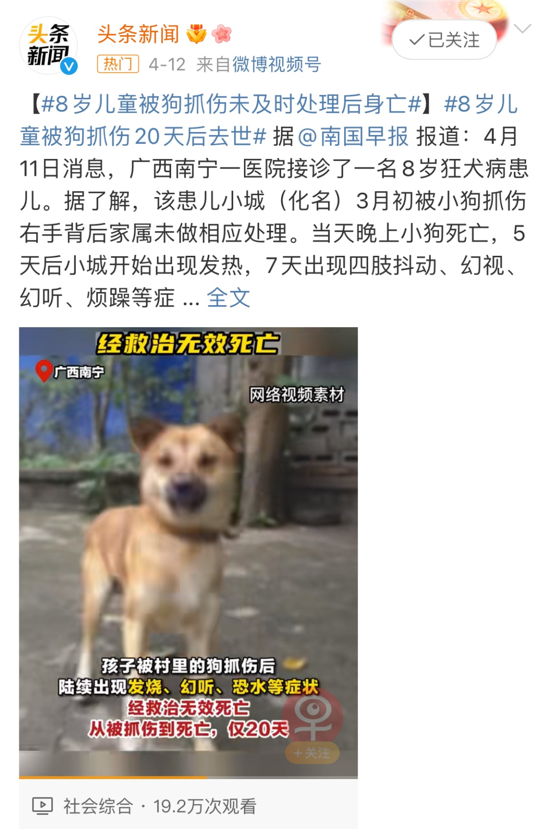 4月11日,廣西南寧一醫(yī)院接診了一名8歲狂犬病患兒。原來,該患兒小城(化名)3月初被剛出生3個月的小狗抓傷右手背后,家屬未做相應(yīng)處理。當(dāng)天晚上小狗死亡,5天后小城開始出現(xiàn)發(fā)熱,7天出現(xiàn)四肢抖動、幻視、幻聽、煩躁等癥狀。去當(dāng)?shù)乜h醫(yī)院住院治療期間,出現(xiàn)恐水、怕風(fēng)、流涎等癥狀,被確診為狂犬病,最終經(jīng)救治無效死亡。